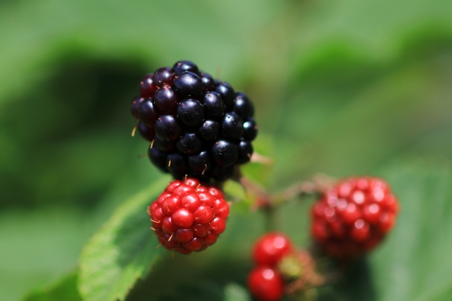 ボイセンベリーの果実の色は、緑→桃→赤→紫→黒へと熟す程に変わっていきます。